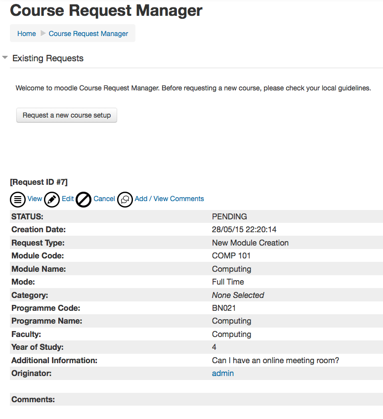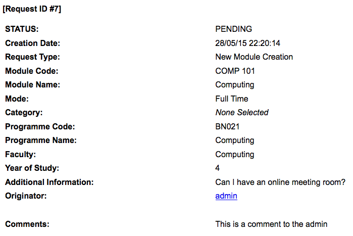 - The view link will simply show a summary of the request and any comments that have been recorded by the user or the admin