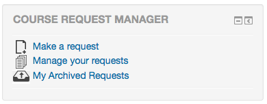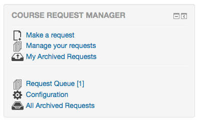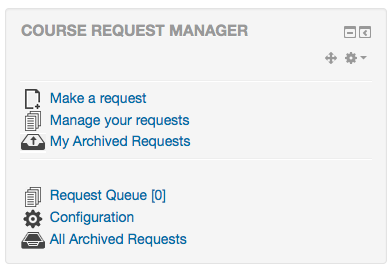 The course request manager block will display different options depending on the role of the user. Administrators will have access to all of the block functions