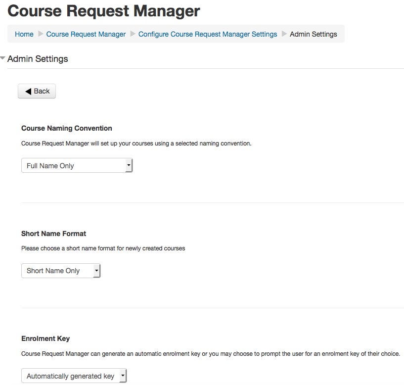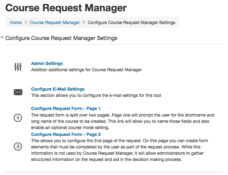 We will look at each of these in turn. Lets start by looking at the Configure Course Request Manager Settings option.