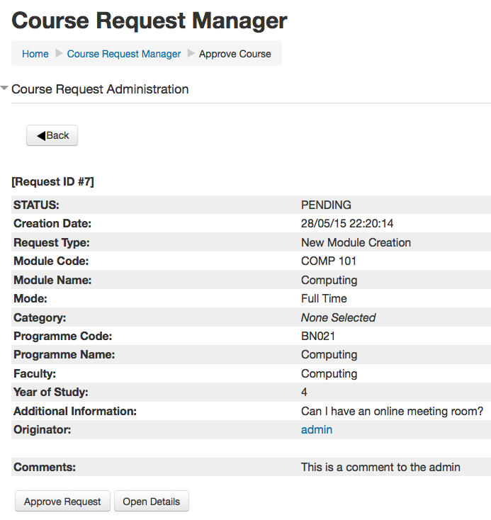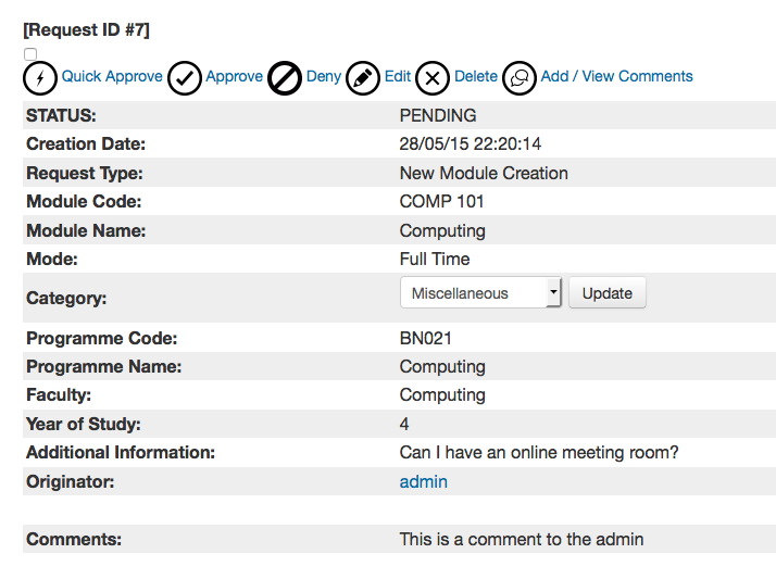 You can see from the screenshot above, that a administrator can approve, deny, edit, delete or add/view comments for a given request.