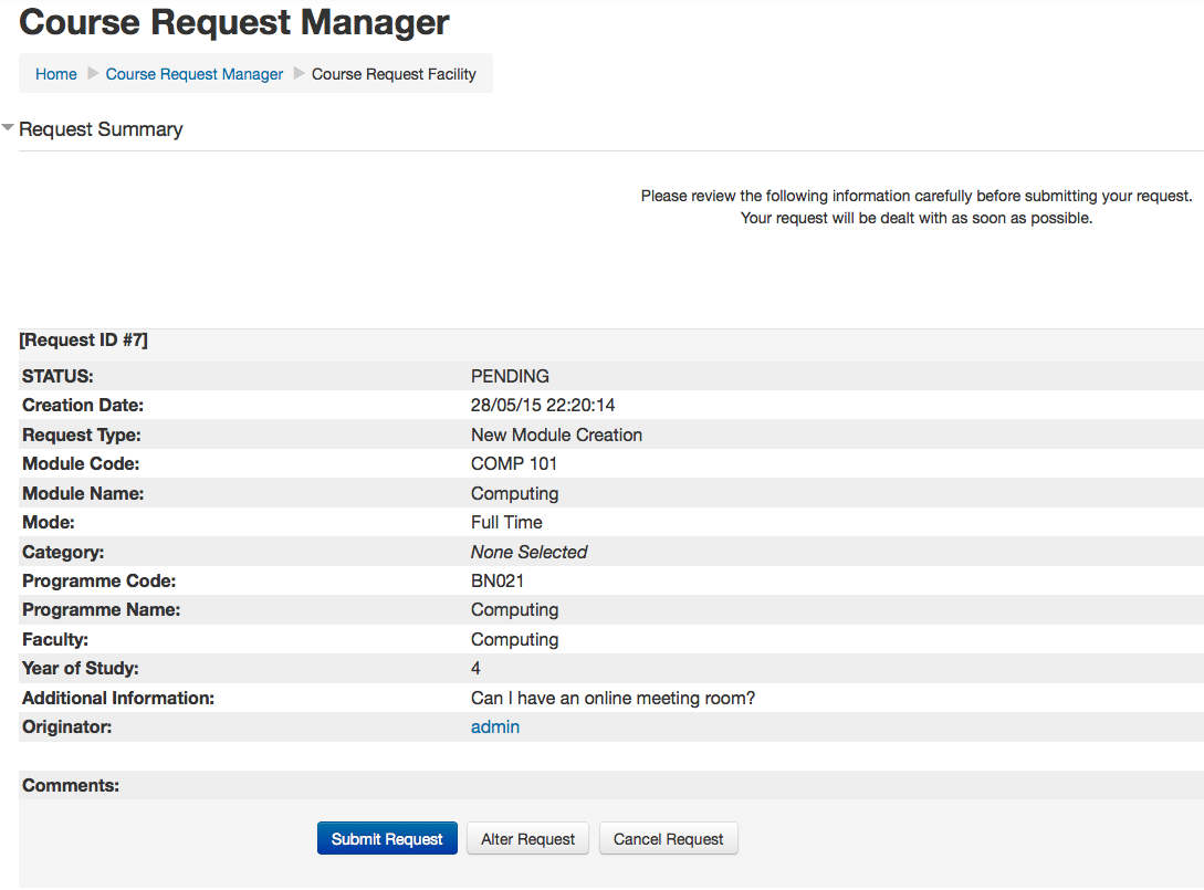 At this point, a user can submit the request, alter it or simply cancel the request process. Once submitted, the user is redirected to the ‘Manage requests page’. Here a user can view the request, edit the request, cancel the request or add comments to the request.