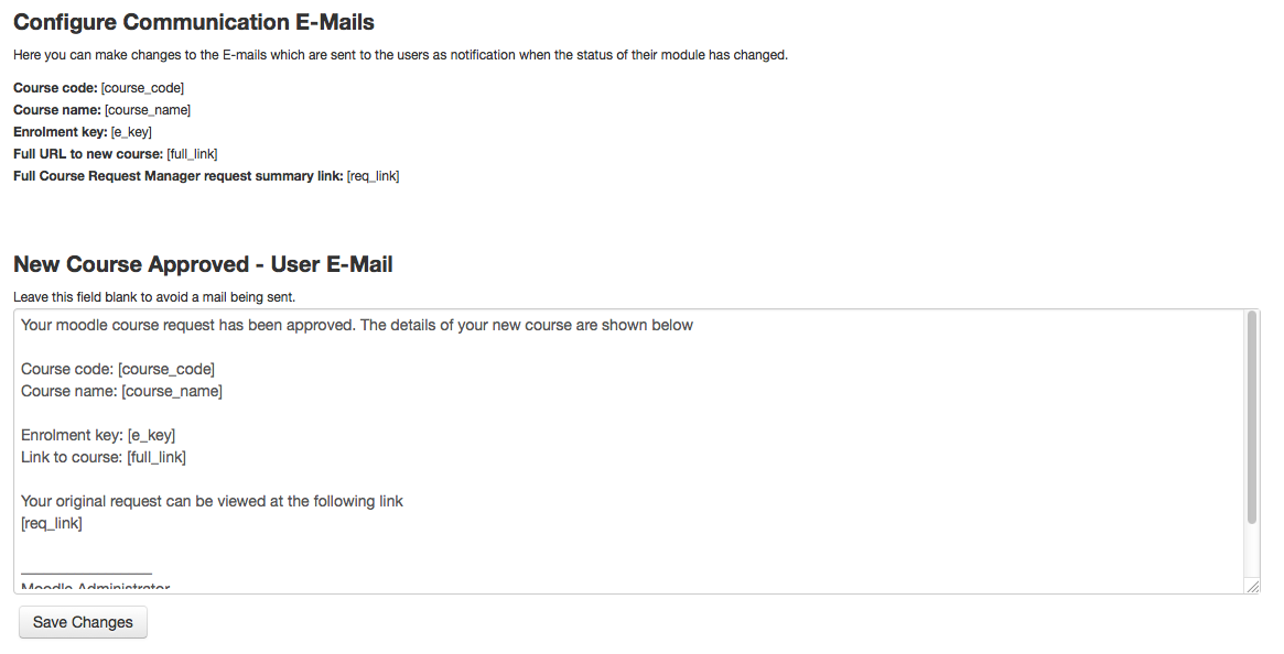 In this section you can also configure the default emails that are sent at the various stages of a course request. There are 11 possible emails that may be sent by the request manager.