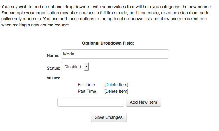 You can see that on this form, I have added some text fields, a drop down list and a text area. In this way I can get my users to be more specific when entering in course requests and force them to structure the information that will assist in the processing of a request.
