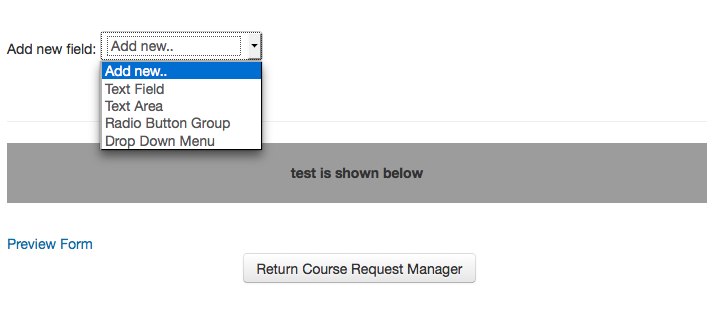 Here you can start to add form elements (fields) which the users will be asked to complete during a course request. To add a form element, simply select the element type from the ‘Add new field’ drop down. You may add text fields, text areas, drop downs or radio button groups.