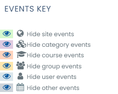 The calendar can display site, course, group, user and – new in 3.4 – category events in addition to assignment and quiz deadlines, chat times and other course events. Note the colour coding on the screenshot below.