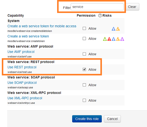 In capabilities – filter for the word service – click on Allow for Web service: REST protocol, or whichever protocol you’re using