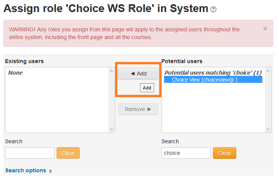 10) Enrol your new user, “Choice View User”, as a teacher in all courses from where you want to access the choice activities. This is needed so that the web service will be able to access the choice activity details using your user’s token.