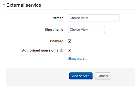 Add the web service, call it Choice View or something similar, click on Enabled, click on Authorised users only and finally click on Add Service.