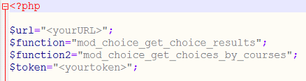 <?php $url="<yourURL>"; $function="mod_choice_get_choice_results"; $function2="mod_choice_get_choices_by_courses"; $token="<yourtoken>"; // Grabs choice details including title $ch2 = curl_init(); curl_setopt($ch2, CURLOPT_URL, "$url/webservice/rest/server.php?wsfunction=$function2&wstoken=$token&lmswsrestformat=json"); curl_setopt($ch2, CURLOPT_RETURNTRANSFER, 1); $result2 = json_decode(curl_exec($ch2)); if (isset($_REQUEST['choiceid'])) { $choiceid=intval($_REQUEST['choiceid']); } else if (count($result2->choices) > 0) { // accessible choices found $choiceid=intval($result2->choices[0]->id); } else { $choiceid = 0; // default value } if ($choiceid < 1) { echo("invalid id"); } $colour="249,128,18"; // LMS orange, change as required. $ch = curl_init(); curl_setopt($ch, CURLOPT_URL, "$url/webservice/rest/server.php?wsfunction=$function&wstoken=$token&choiceid=$choiceid&lmswsrestformat=json"); curl_setopt($ch, CURLOPT_RETURNTRANSFER, 1); $result = json_decode(curl_exec($ch)); $graph_title = ""; $dropdown = "<select name='choiceid' onchange='this.form.submit()'>n"; $dropdown .= "<option value='0'>Select</option>n"; foreach ($result2->choices as $choice) { $dropdown .= "<option value='{$choice->id}'"; if ($choice->id == $choiceid) { $graph_title = $choice->name; $dropdown .= " selected"; } $dropdown .= ">{$choice->name}</option>n"; } $dropdown .= "</select>n"; // data for bar graph $chart = new stdClass(); $data = array(); $labels = array(); foreach ($result->options as $a) { $data[] = $a->numberofuser; $labels[] = $a->text." (".round($a->percentageamount,1)."%)"; } $chart->labels = $labels; $dataset = new stdClass(); $dataset->data = $data; $dataset->fillColor = "rgba({$colour},0.5)"; $dataset->strokeColor = "rgba({$colour},0.8)"; $dataset->highlightFill = "rgba({$colour},0.75)"; $dataset->highlightStroke = "rgba({$colour},1)"; $chart->datasets = array($dataset); curl_close($ch); ?> <!doctype html> <html> <head> <meta http-equiv="refresh" content="5" > <title>Bar Chart</title> <script src="<yourchartjslocation>"></script> </head> <body> <center> <h1><?php echo($graph_title); ?></h1> <div id="canvas-holder"> <canvas id="chart-area" width="900" height="600"/> </div> <form><?php echo($dropdown); ?><noscript><input type="submit" value="Submit"></noscript></form> <script> var pieData = <?php echo json_encode($chart); ?>; window.onload = function(){ var ctx = document.getElementById('chart-area').getContext('2d'); window.myPie = new Chart(ctx).Bar(pieData, {animationSteps : 1, responsive: false}); }; </script> </center> </body> </html>