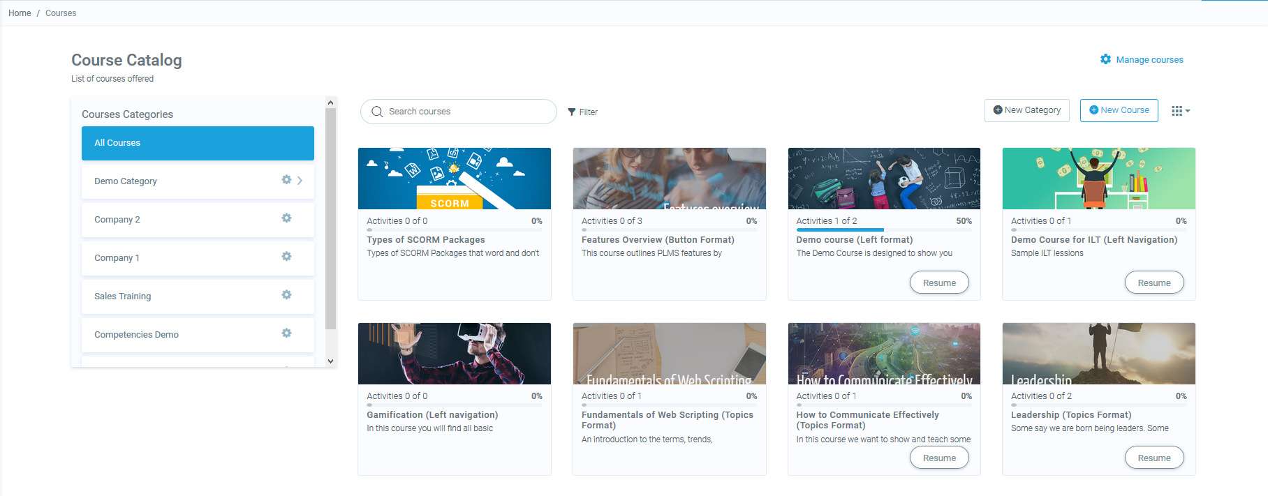 On Course Catalog (Course Catalog on the left navigation menu), you can see all the courses available on the site with their respective category. You can click any one available Category or All Courses tab and explore the courses.