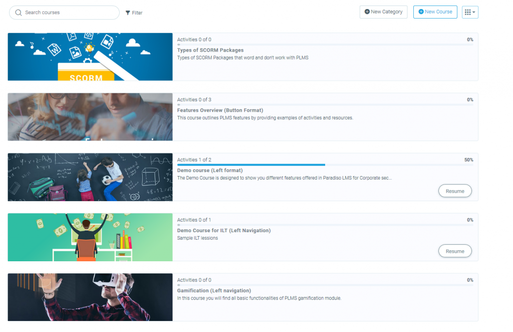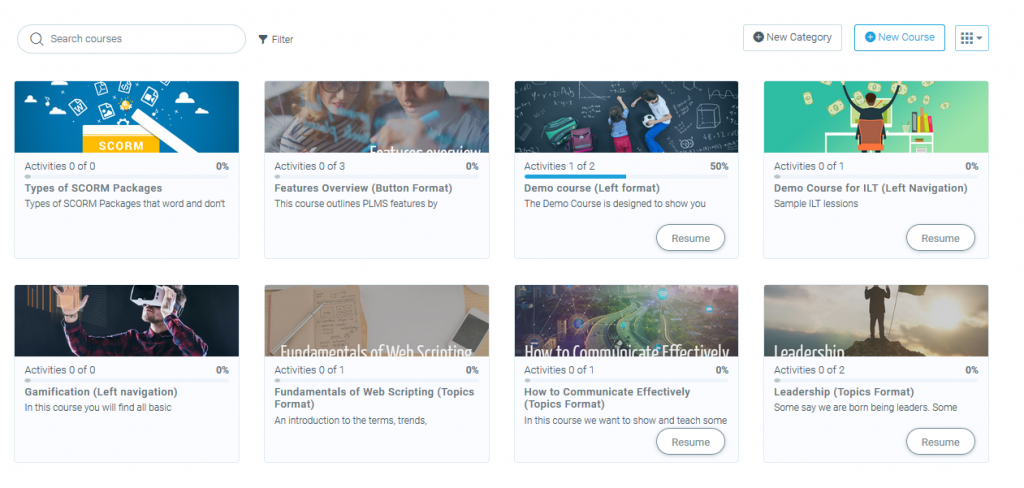 It also provides a quick access to the “manage courses” page where admins can organize their LMS content as needed.