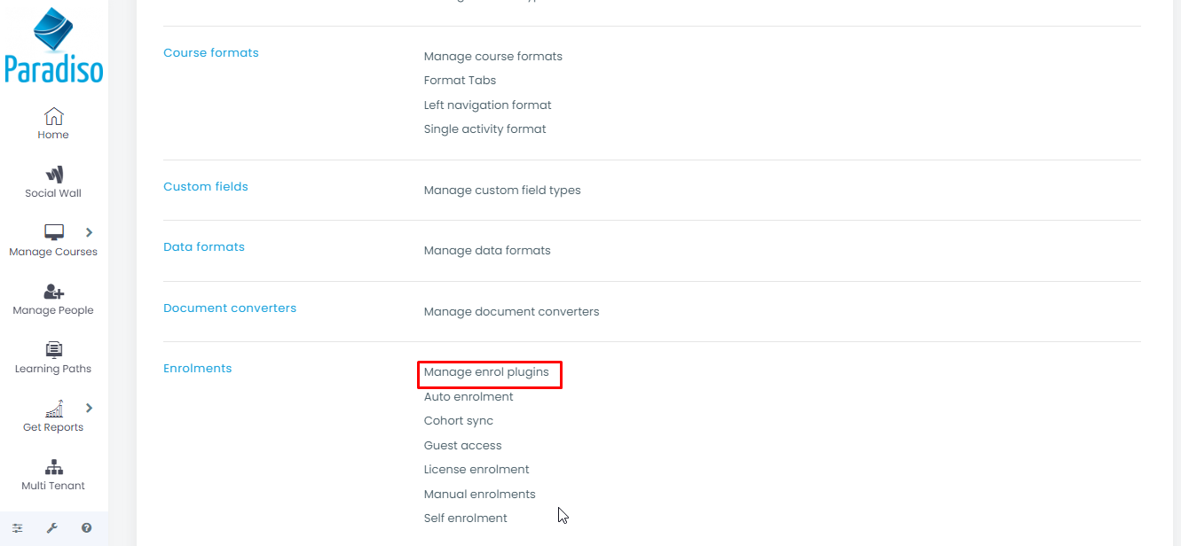 - Step 3: Click on Manage enrol plugins under the Enrolments.