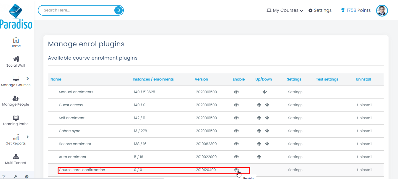 - Step 1: Click on Settings to enable the course enroll plugin.