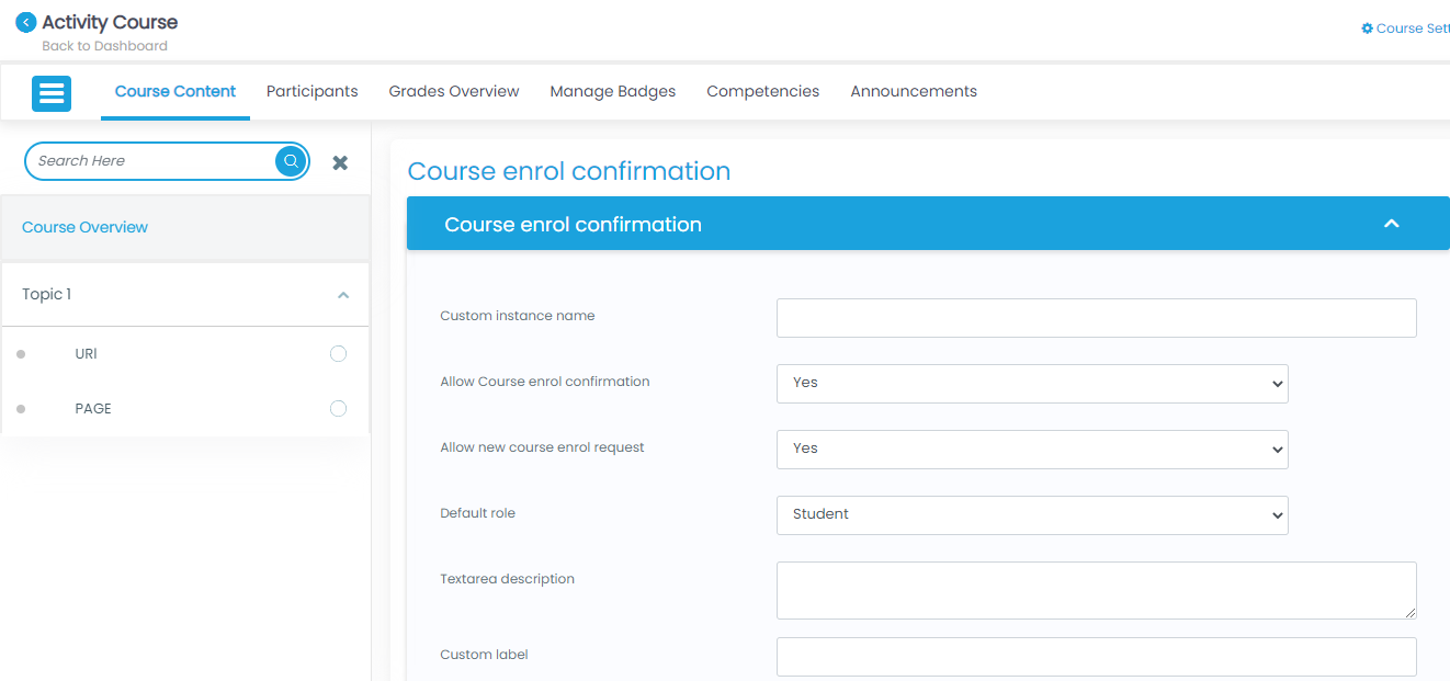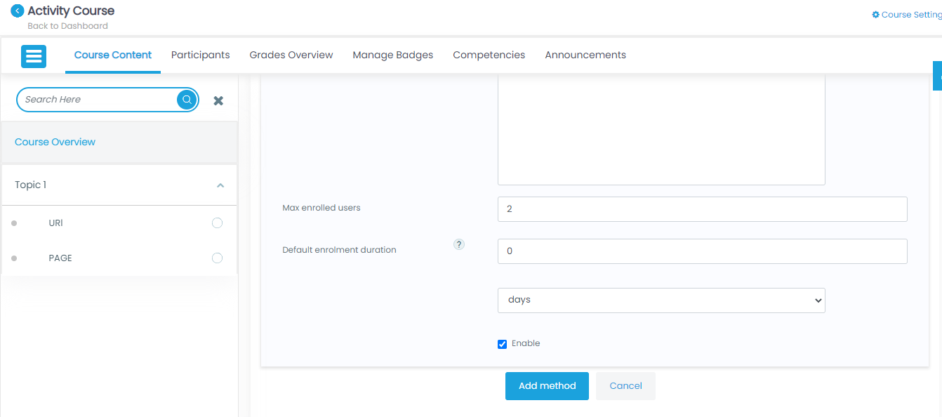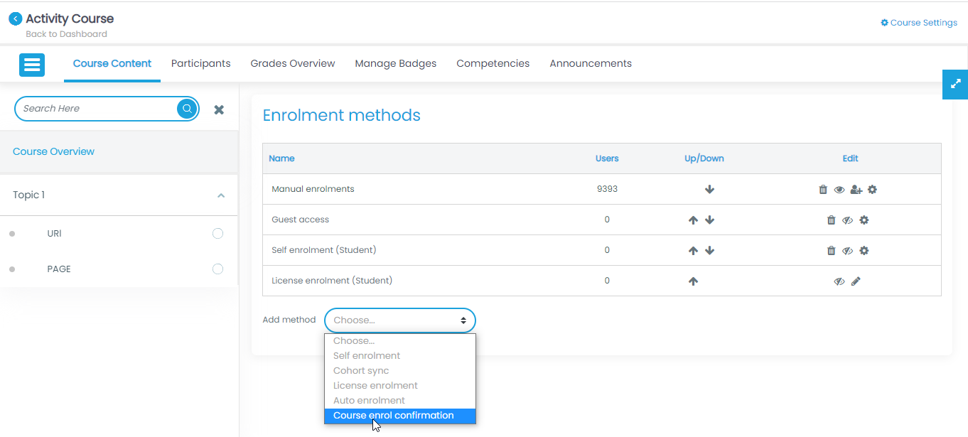 - Step 6: Select the course enrol confirmation method from the enrolment methods drop-down list.