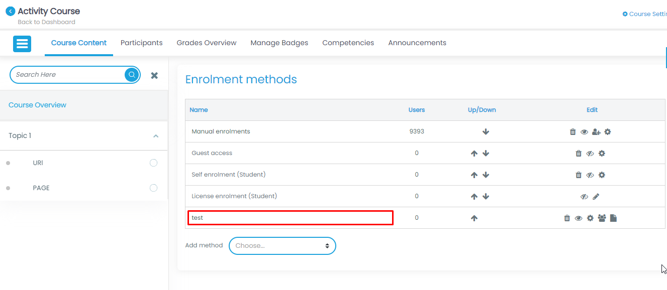 - Step 8: Created Test Course enrol method is added under the Enrolment methods. All other methods should be disabled while created Test course enrol method is enabled.