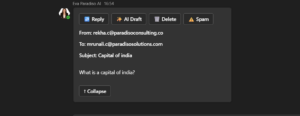 If the user receives an email in Outlook, an email card will also appear in the Eva Teams app chat