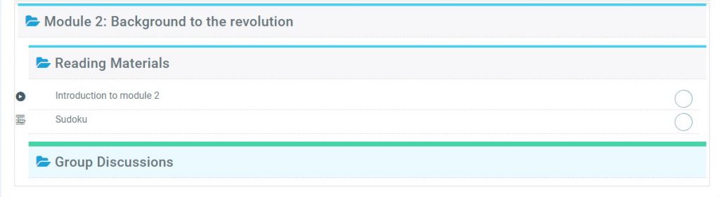 The instructor can make some subsections collapsed and some expanded (such as with ‘Reading materials’ in the next screenshot). Expanded subsections show their title and content in a similar way to using labels to divide up activities in a regular course format:
