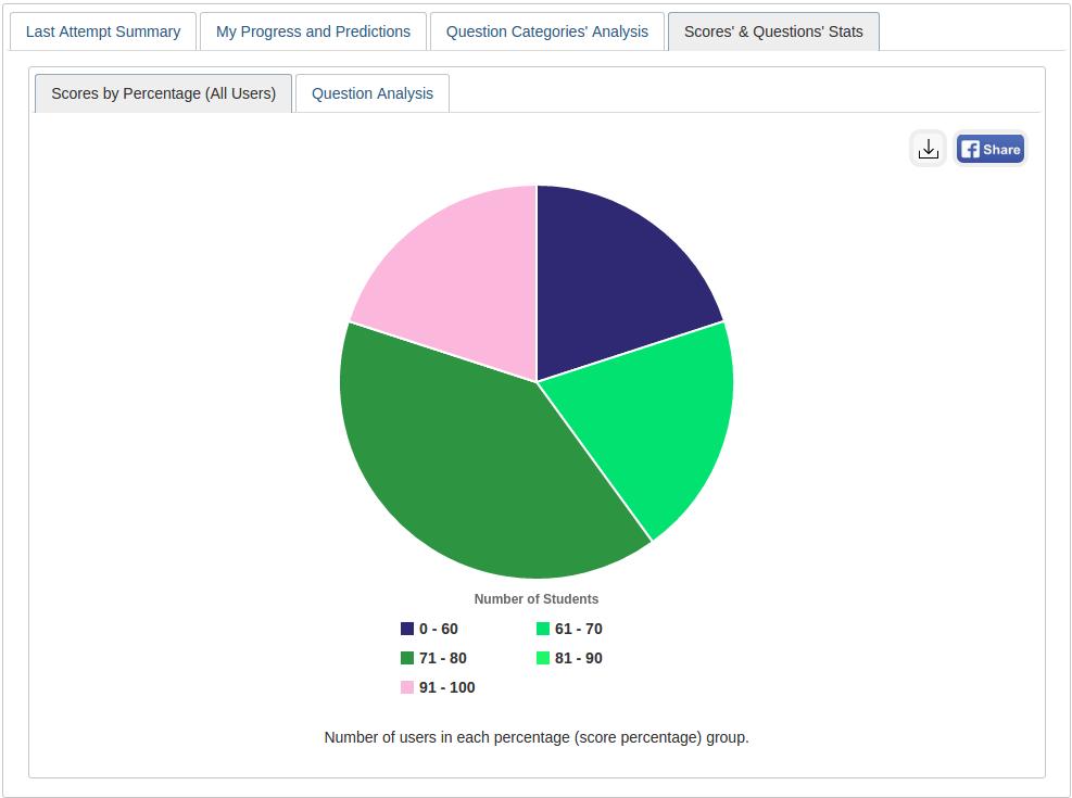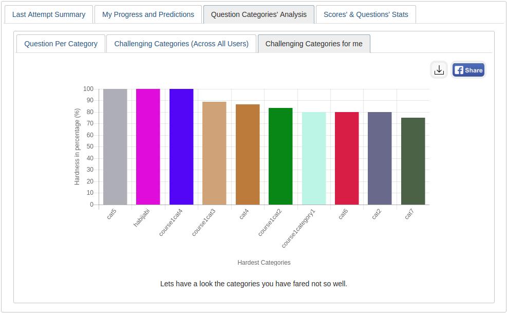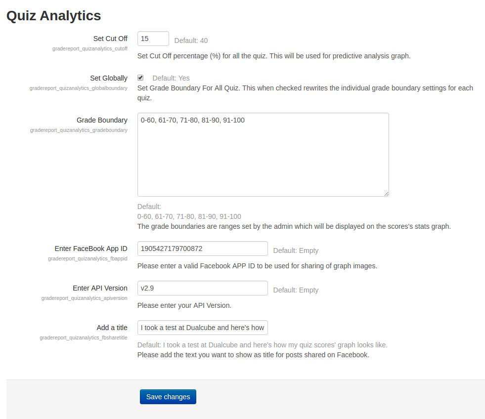 Here you can Set Cut Off for all the quizzes of the course, can set Grade Boundary and add Facebook App ID, Facebook API version and Title to share the graph on Facebook.