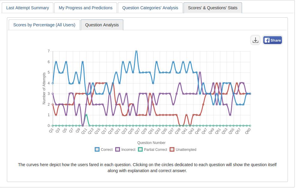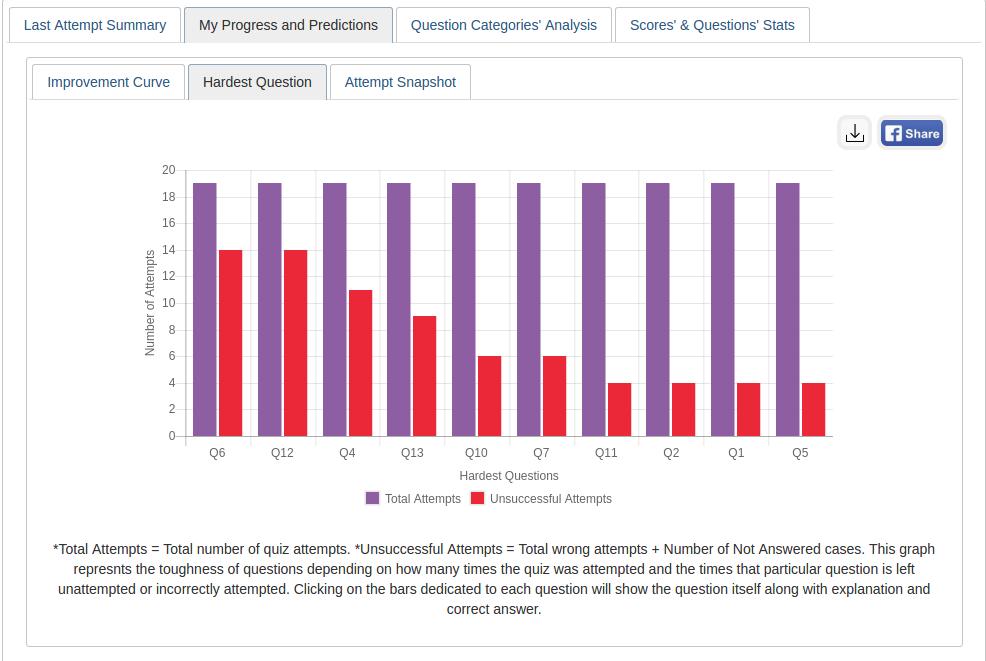 many times the quiz was attempted and the times that particular question is left unattempted or incorrectly attempted. Clicking on the bars dedicated to each question will show the question itself along with the explanation and correct answer.