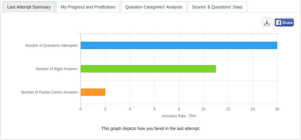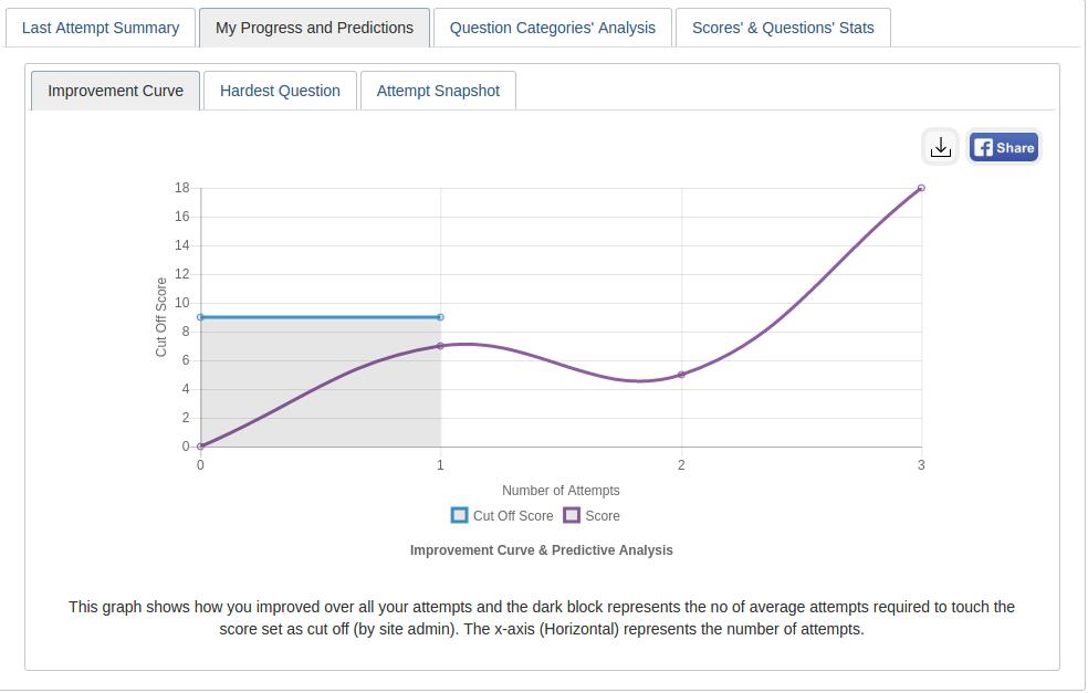 Improvement Curve – This graph shows how you improved overall your attempts and the dark block represents the no of average attempts required to reach the score set as cut off (by site admin).