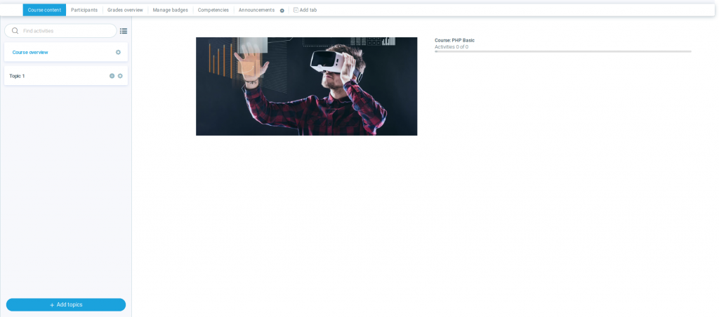 At any time, only course overview which has course details and image will be visible. The topic/section panel will be in collapsed mode by default. The user can view the content by clicking on the corresponding topics/sections.