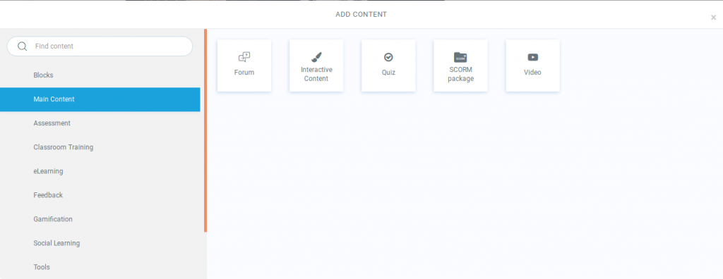 - Add important content, gamification, classroom training, feedback, social learning, and different tools in the top panel of the course