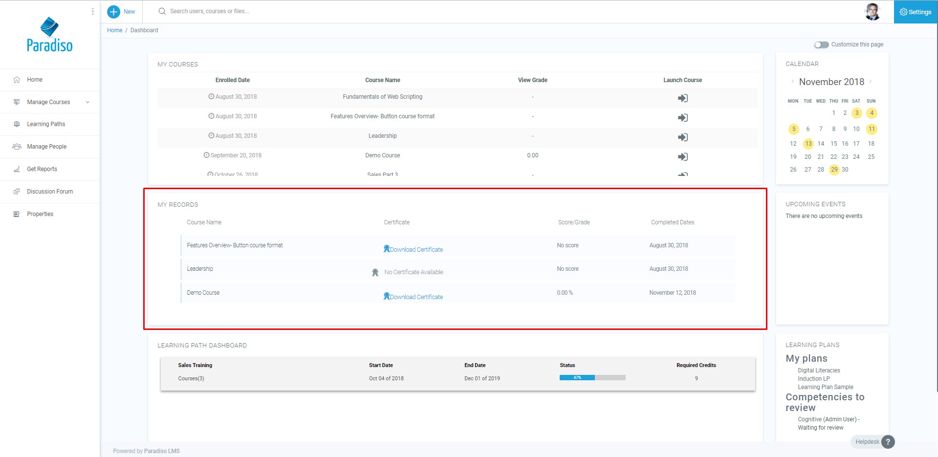 The “My Records” block allows the users to see the transcripts of completed courses.