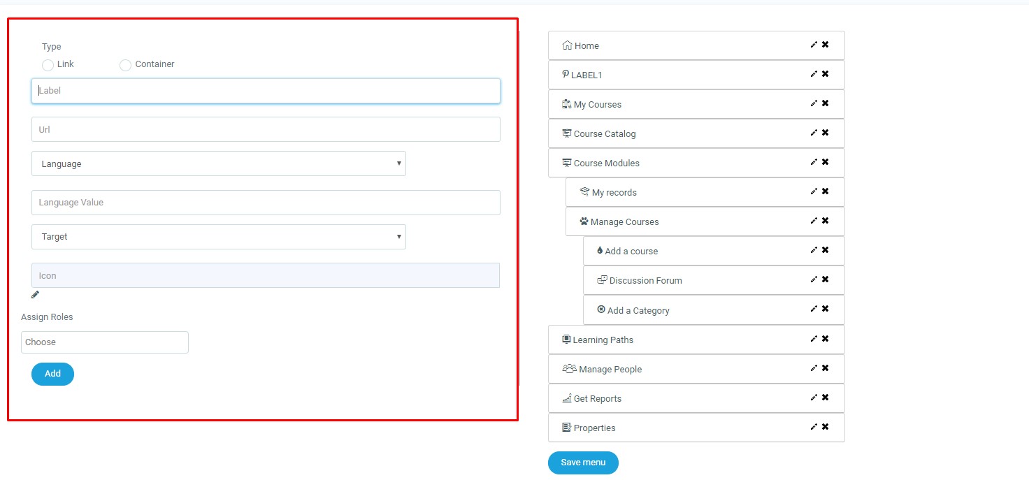 Choose which type of navigation item you wish to add. The most common navigation items are links. Next add a Label, the name that the item will appear as. Then add the target page’s URL and select whether the URL will open in the same page or open a new page. Afterward, you can either select an existing icon or upload your own image to represent your new navigation item. Finally, select the roles that this item will be available too.