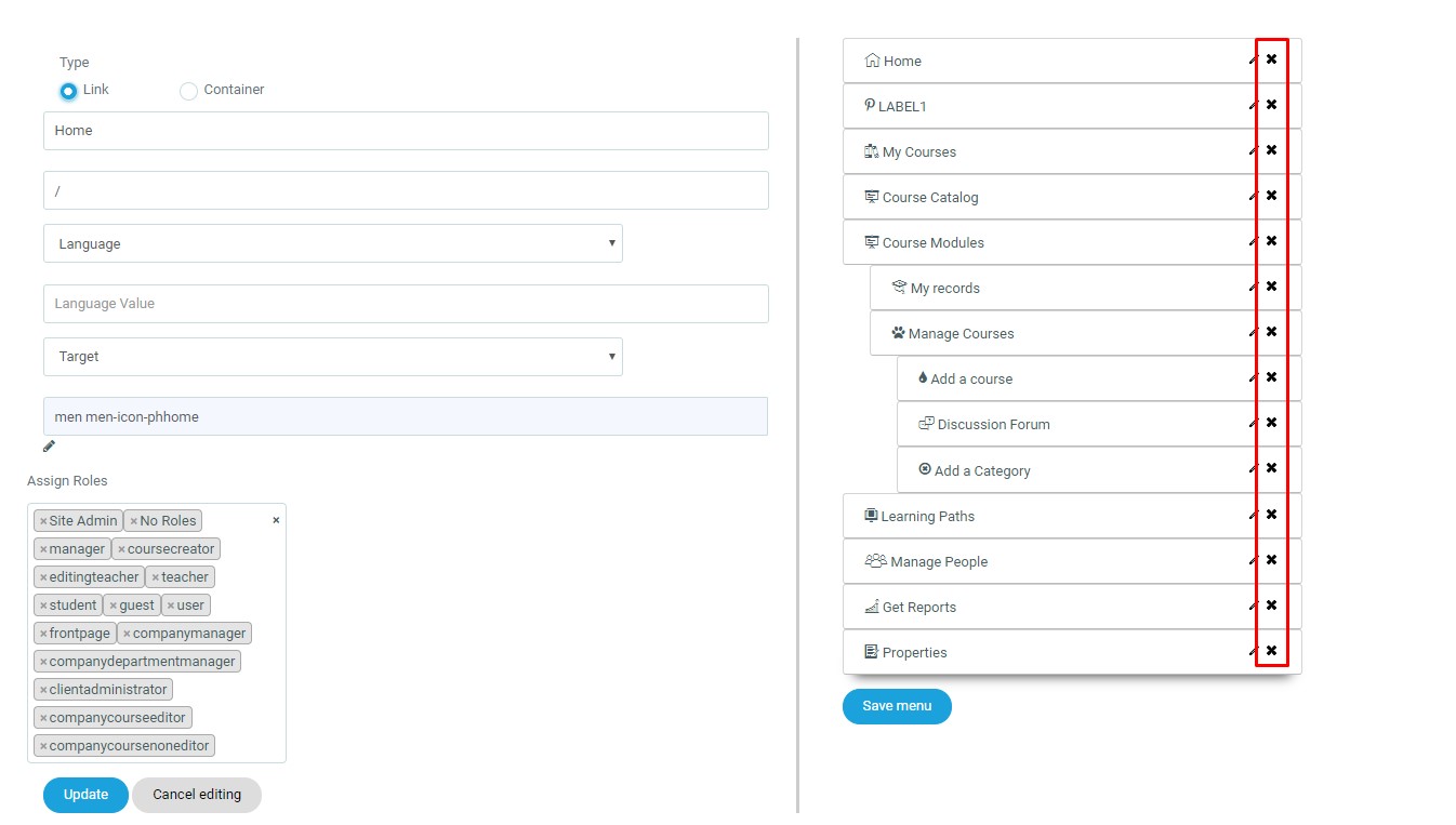 Items can be moved simply by clicking and dragging them to the desired location. Clicking the X icon will delete the item. Click Save Menu when you are finished moving and deleting.