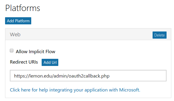Uncheck the “Allow Implicit Flow” checkbox and set the callback URL. The callback URL should point to “your LMS site URL + /admin/oauth2callback.php”. If your LMS site was available at https://lemon.edu/ the callback URL would be https://lemon.edu/admin/oauth2callback.php. It is important that your LMS site uses https and not http. Microsoft will not allow the callback url if it is not using https.
