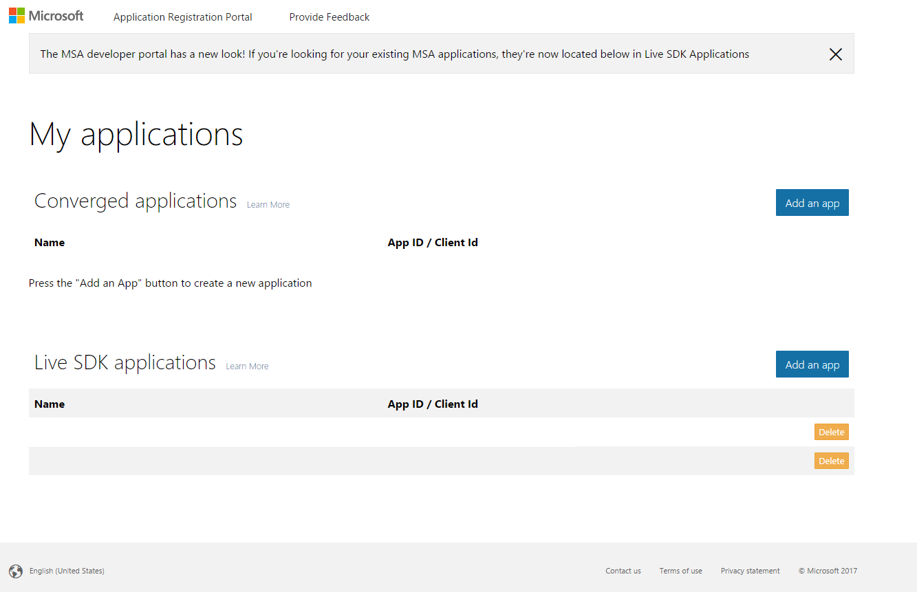 Note: If you have previously registered Applications with an older API your Application Console may look different. In this case you should create a new “Converged Application”.