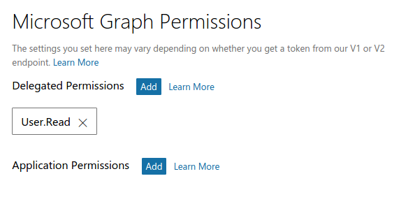 Make sure the “Microsoft Graph Permissions” section contains the “User.Read” permission.