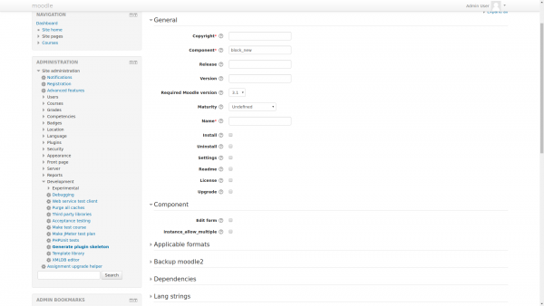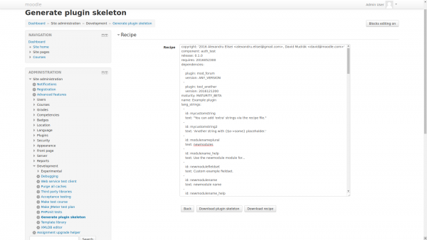 - Proceed to Administration > Site administration > Development > Generate plugin skeleton