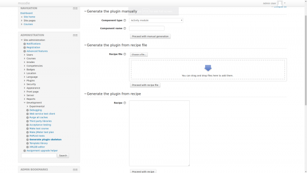 The web interface is accessible from Administration > Site administration > Development > Generate plugin skeleton. You are given a choice between filling in all the required fields manually, uploading a previously created recipe file or writing the recipe by hand in the text area (presumably by copying and pasting an existing recipe).