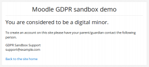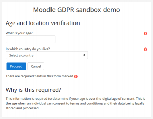 In LMS 3.4.2 onwards, a ‘Digital age of consent verification’ may be enabled in ‘Privacy settings’ in the Site administration. The default digital age of consent, and the age in any country where it differs from the default, may be specified. Country codes are as specified in ISO 3166-2.