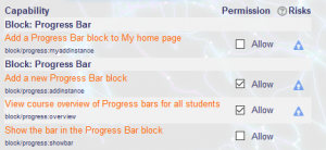 Controls whether the Progress Bar can be added by a user to the Dashboard (formerly My home) page. By default, this is allowed for all authenticated users. - Add a new Progress Bar block (block/progress:addinstance)