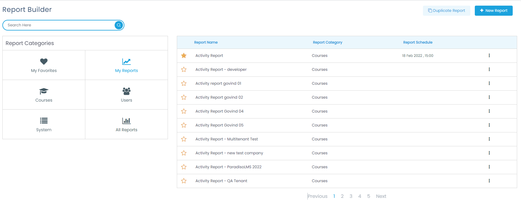 icon to the left of the report to tag or un-tag as favorite. - You have your Courses reports which are to draw data from your courses. Some examples are Course overview, Most popular Courses by enrollment and Views, Quiz overview, Video Reports