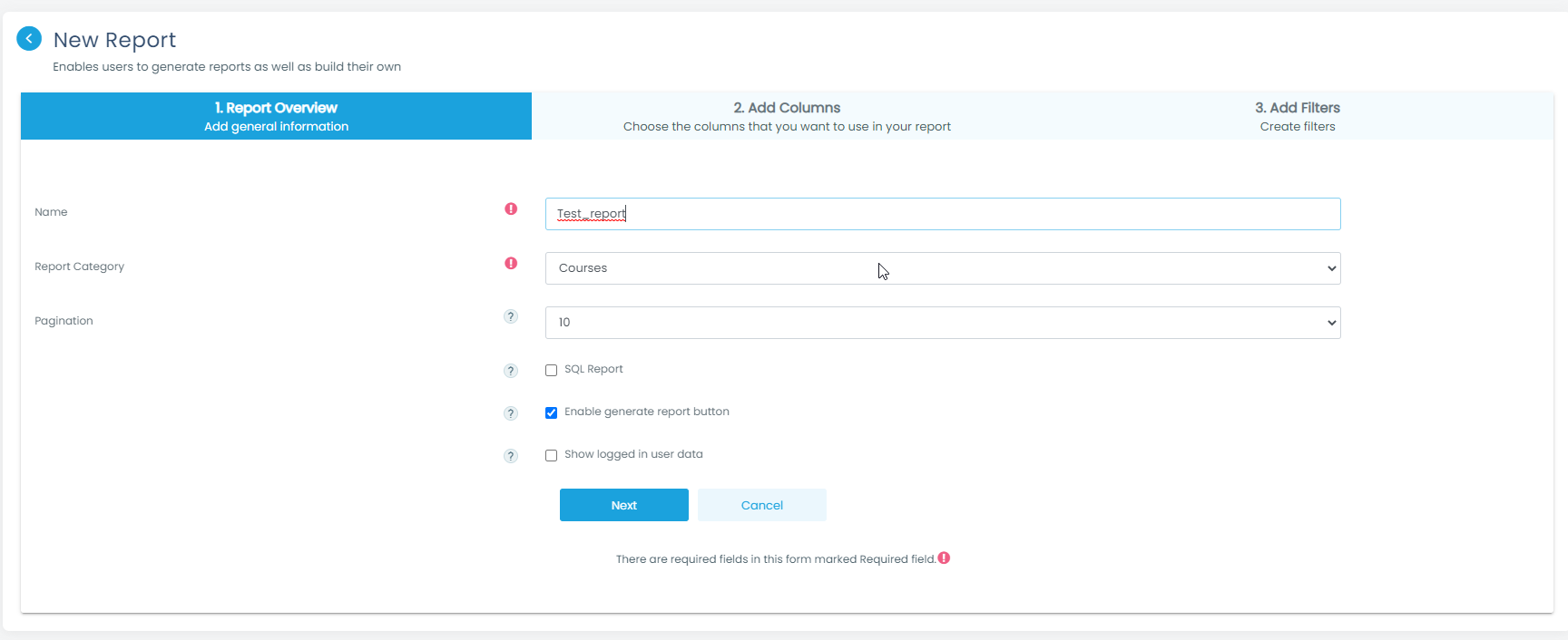 - Enable generate report button: if you want your report to have the option to be able to be downloaded as a CSV file, it is necessary to enable this option.