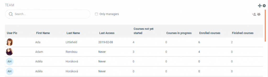 Each member’s record shows their number of Courses not yet startedCourses in progress, and Finished courses. Clicking on a number will redirect you to a list of that user’s courses in that topic. For users who manage several sub-managers or supervisors, each with their own team, there is a search bar to quickly filter teams, based on the team leader’s name.