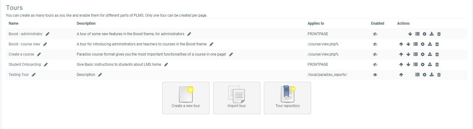 - Here you see any existing user tours and have the option to create a new tour, import a tour or browse user tours on the LMS.net User tours repository.