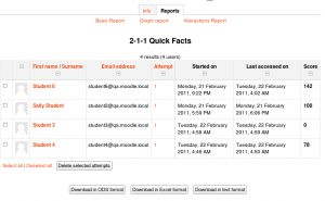 The interactions report may be downloaded in ODS, Excel or text format and include responses, right answers and results (whether the response to a question was right or wrong).