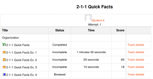 A detailed report of each user’s attempts may be obtained by clicking on the number in the attempts column. The track details link provides information on specific SCORM values recorded in LMS by the SCORM object.