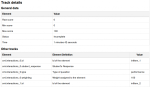 Note that the tracked details depend heavily upon what the SCORM object itself is programmed to report. Many SCORM packages created with authoring suites use the suspend_data field to record important information, instead of the traditional SCORM values. This makes deciphering the recorded data extremely difficult.