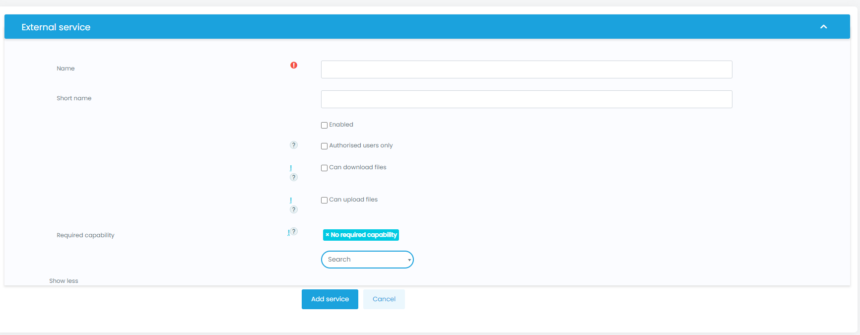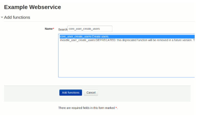 - The required capabilities for the web service functions. These required capabilities are listed when you add a function to the service. For more information about roles and capabilities, read the Manage roles documentation.