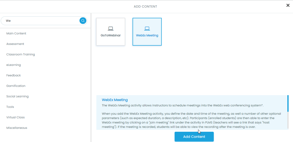 The WebEx Meeting activity allows LMS to seamlessly integrate with WebEx.